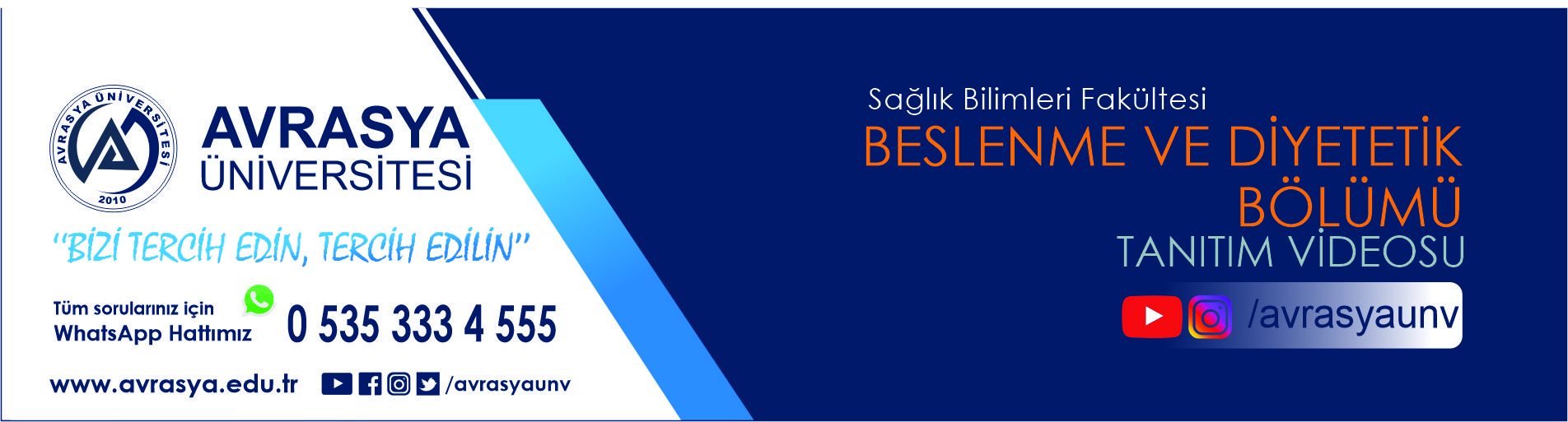 Beslenme ve Diyetetik Bölümü, 2016 yılında Avrasya Üniversitesi Sağlık Bilimleri Fakültesi bünyesinde kurulmuş 4 yıllık bir lisans programıdır. 2016-2017 eğitim- öğretim yılında Üniversitemizin Yalıncak Yerleşkesinde lisans düzeyinde eğitim-öğretime başlamıştır.
